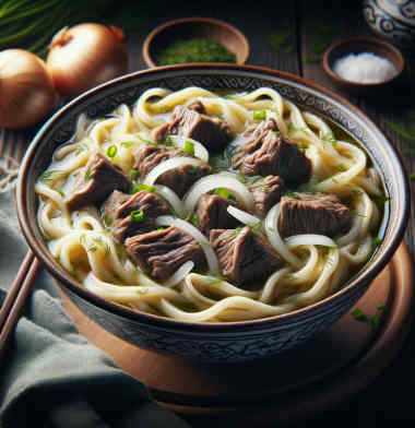 Das Gericht wird in der Regel aus zartem, gekochtem Fleisch wie Lamm, Rind oder Pferd zubereitet und mit Nudeln serviert.
