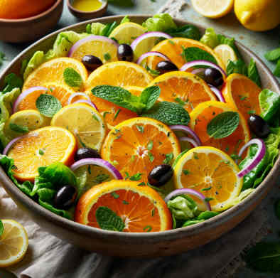4. Orangen-, Zitronenscheiben, Zwiebelringe und schwarze Oliven auf dem Salat anrichten.